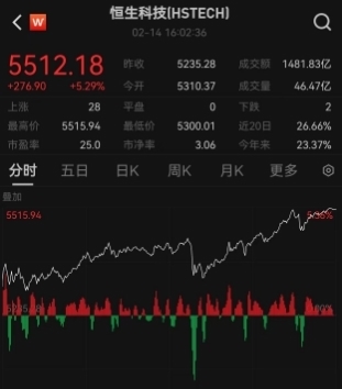 港股也走势激昂,从下午两点开始,原本调头向下的恒生科技指数转头拉升,从不足2%的涨幅一路暴涨超5%,恒生科技互联网指数的大涨超过6.5%,恒生指数涨超3%。